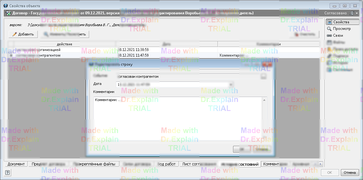 На вкладке фиксируются основные события, связанные с оформлением договора.