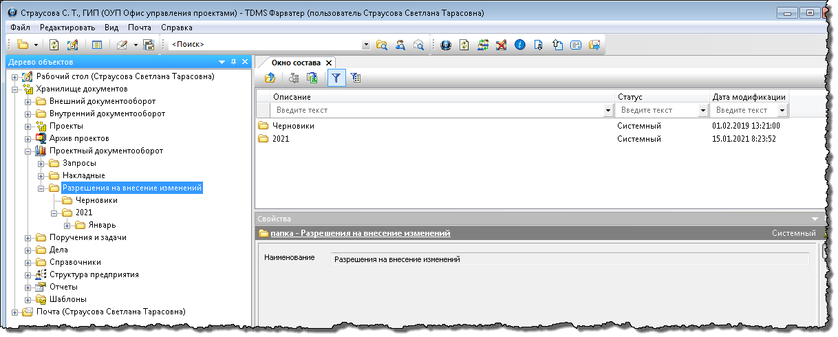 ![]() ·Черновики - системная папка для хранения документов, которым еще не присвоен регистрационный номер. После присвоения такого номера (регистрации), документ переносится в папку, соответствующую году и месяцу регистрации;