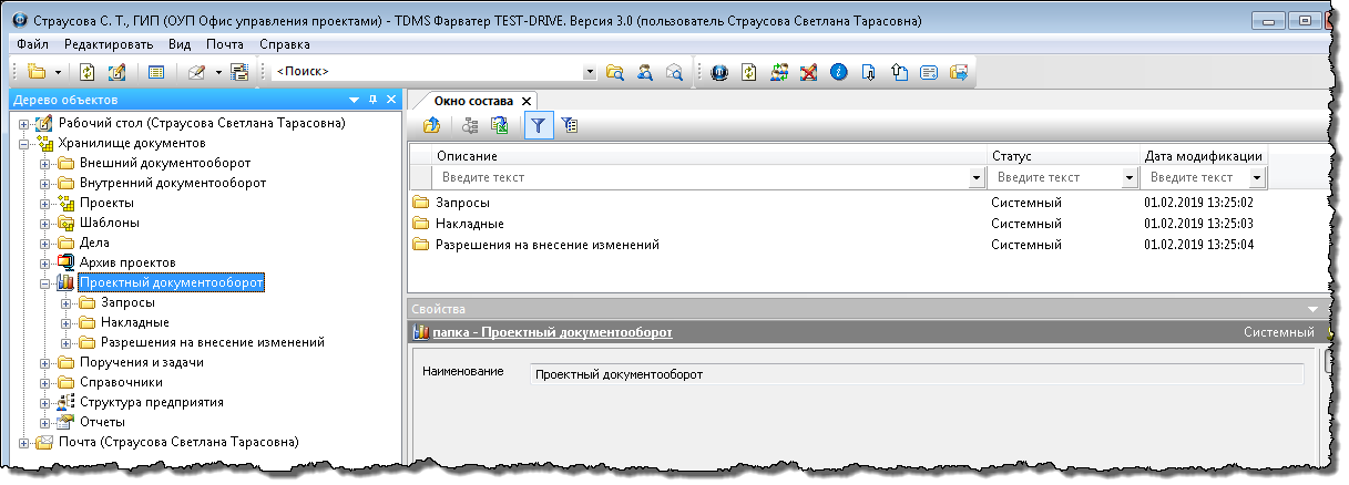Подраздел Проектный документооборот располагается в системном разделе Хранилище документов окна Дерево объектов. Подраздел содержит папки, имена которых совпадают с видами хранящихся в них документов.