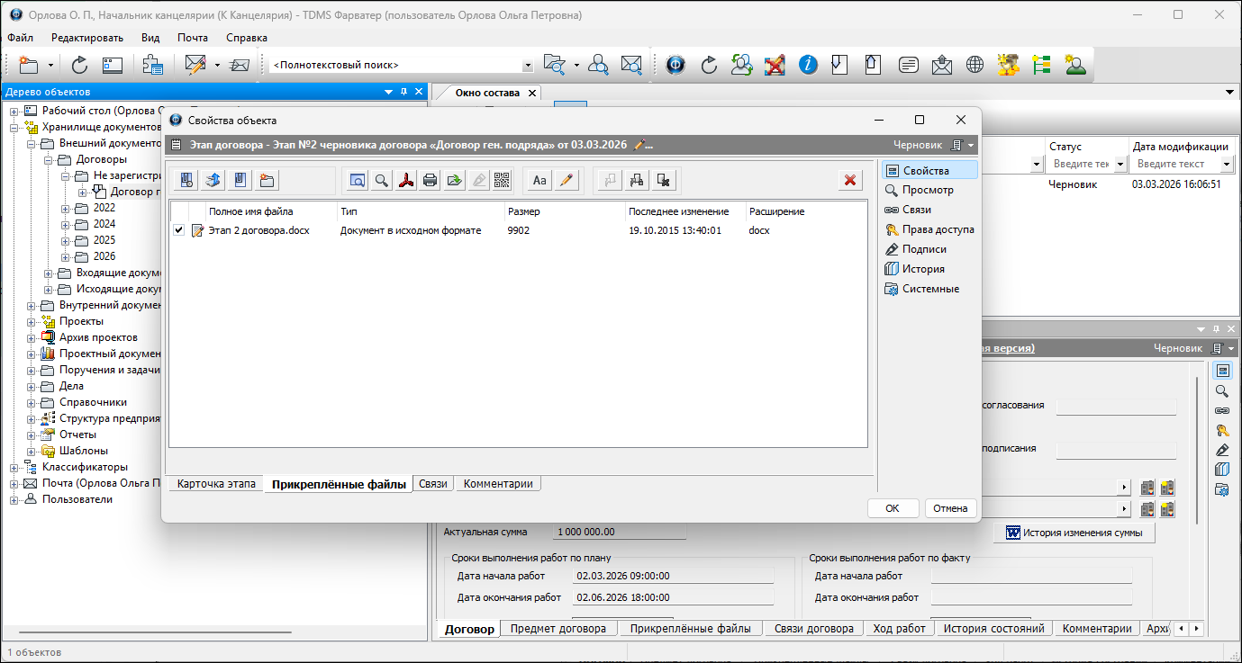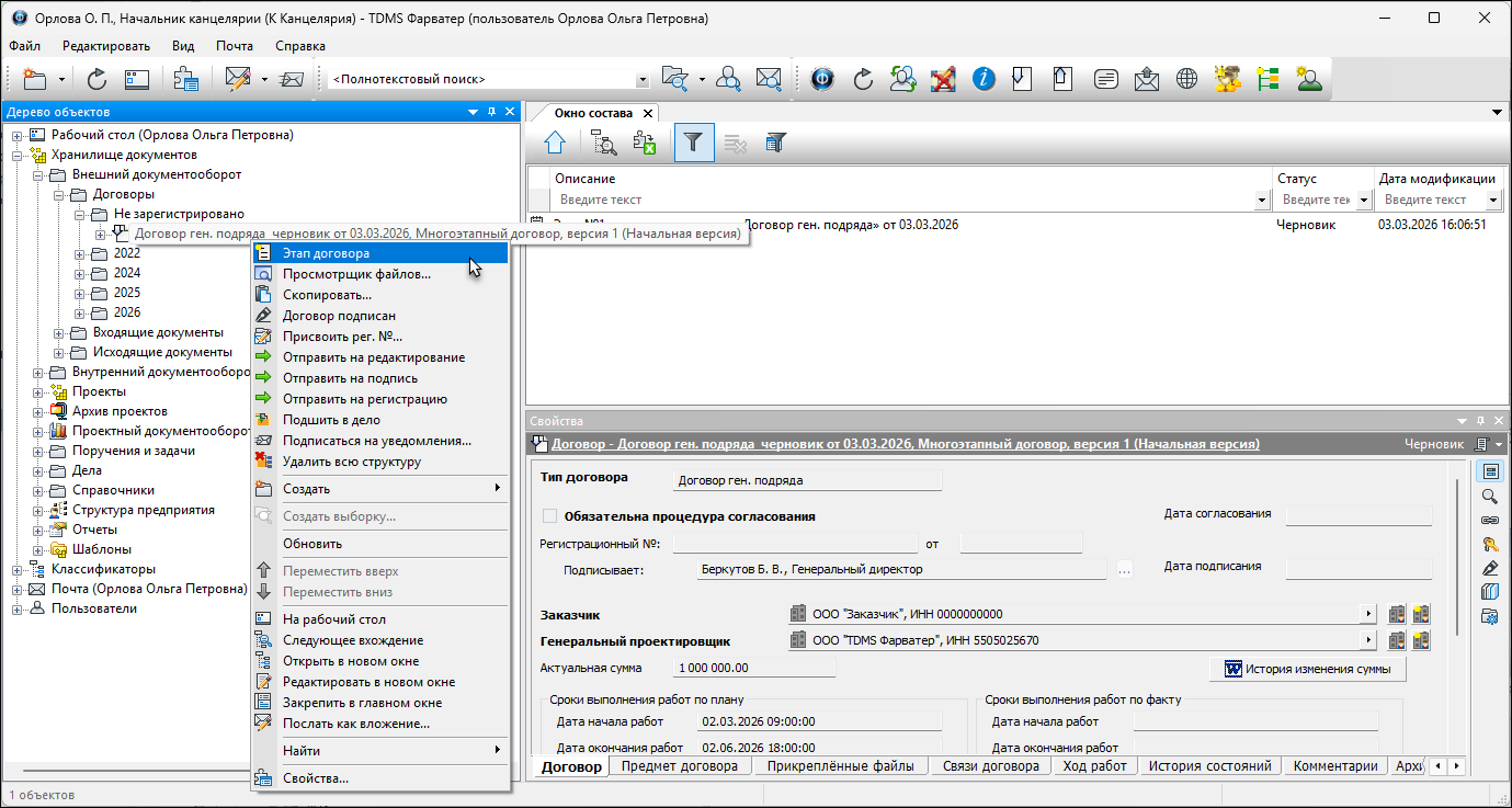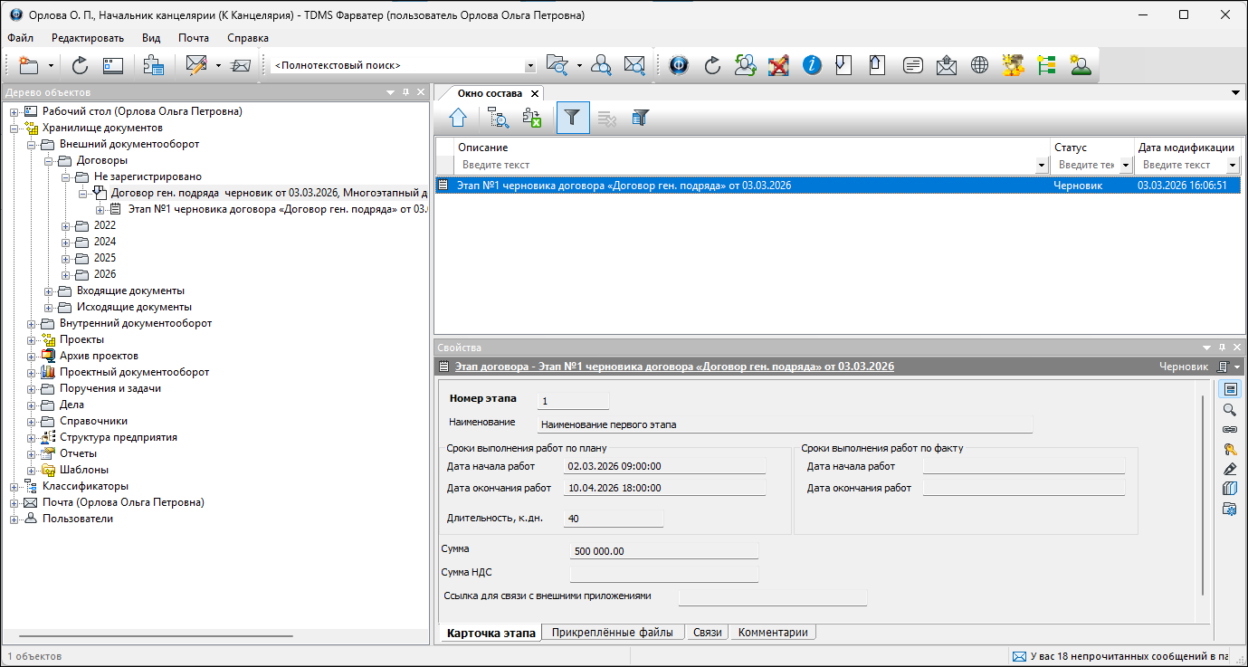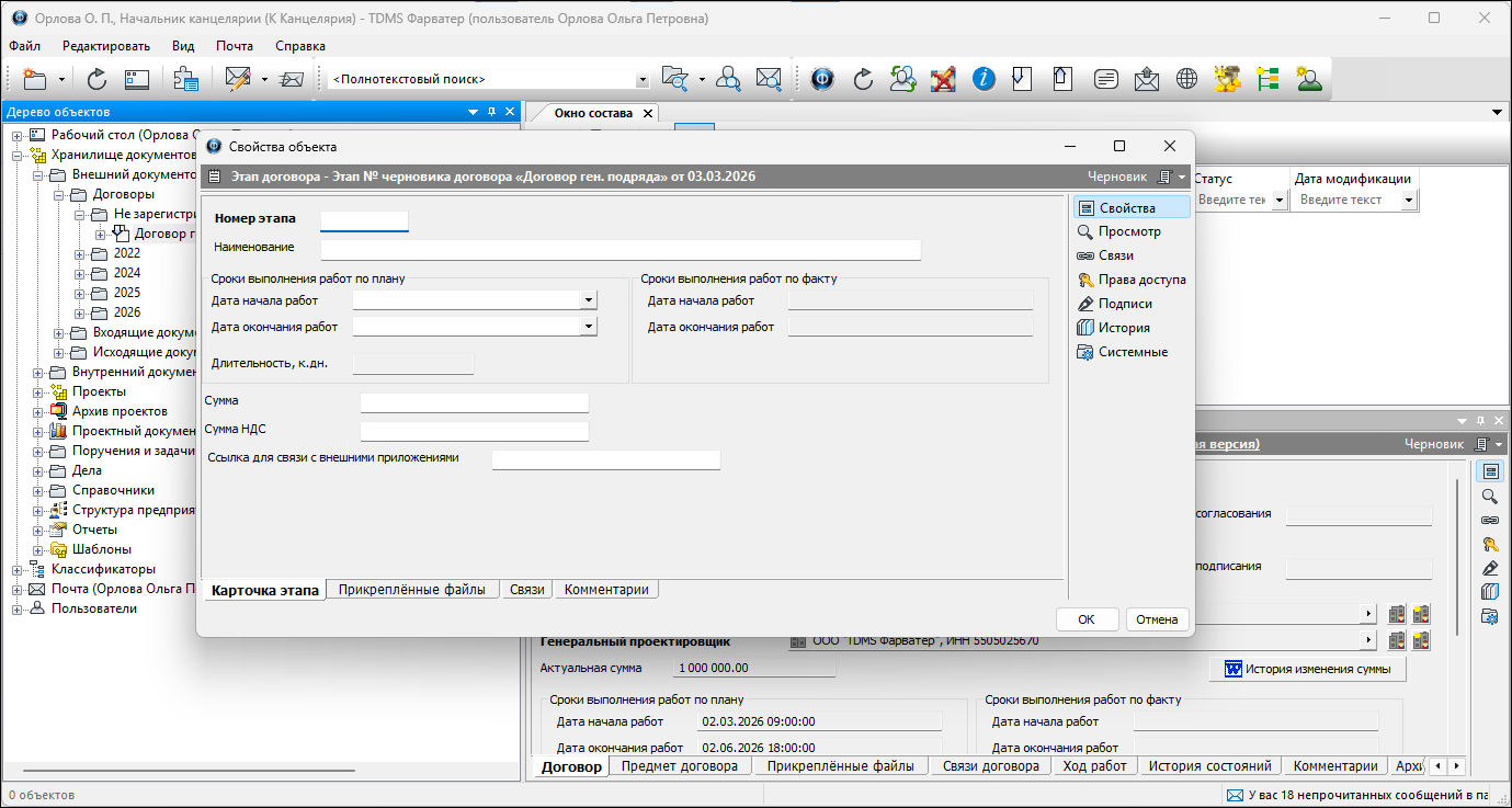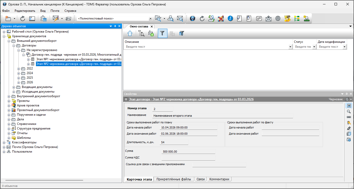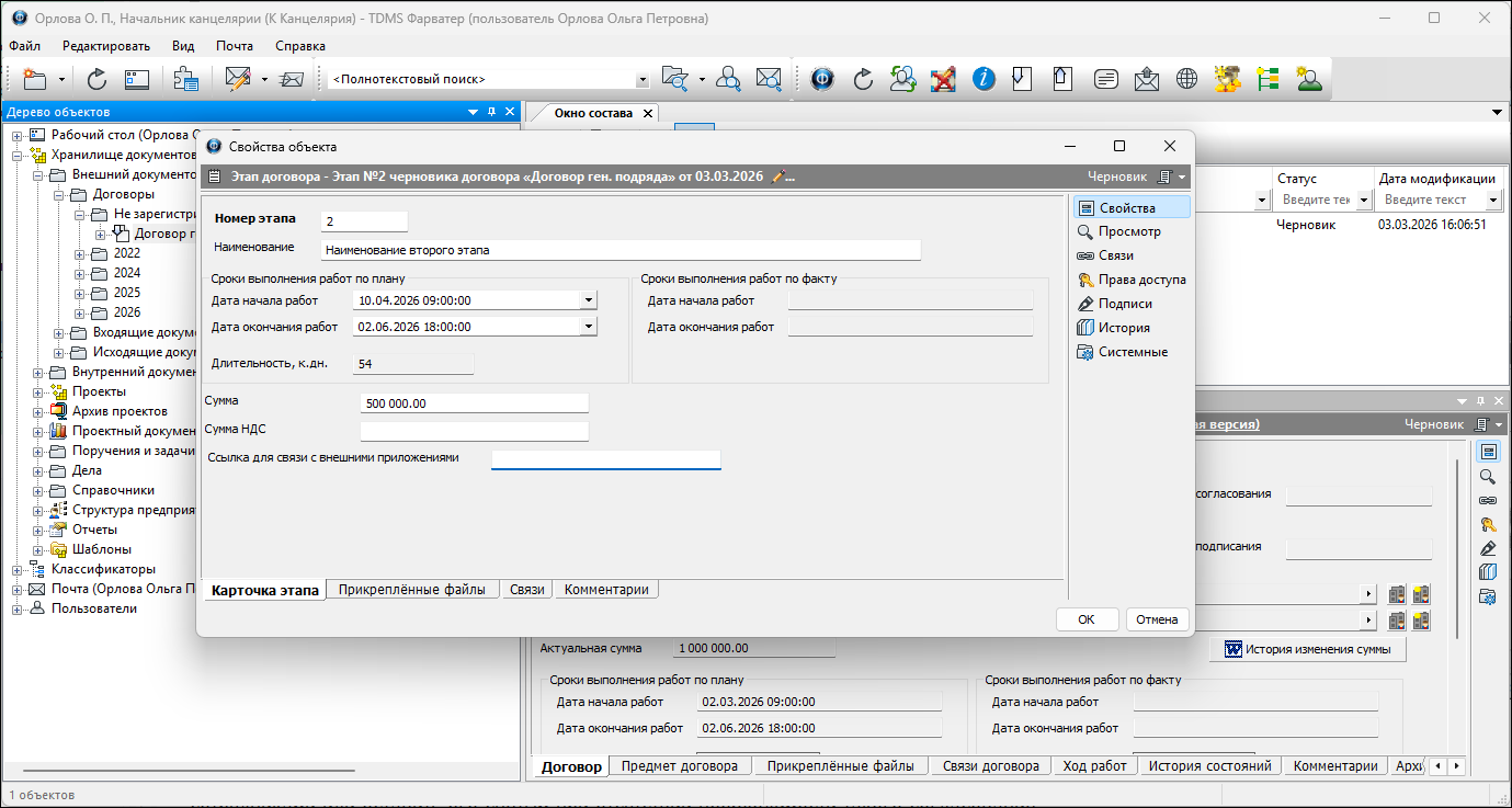5. Сохранить карточку создаваемого объекта. В Дереве объектов этап позиционируется как структурный элемент договора.