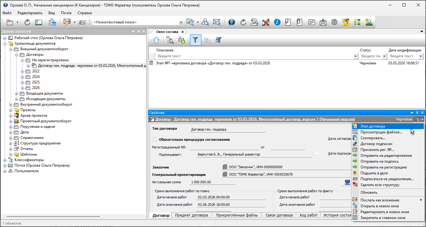 Дальнейшие действия с этапами в системе зависят от потребностей пользователя, наследуется состояние договора: отправить на редактирование другому сотруднику, на подпись (на регистрацию) и т.д. по заложенному в системе жизненному циклу объекта (до начала выполнения договора (команда Приступить к выполнению)).