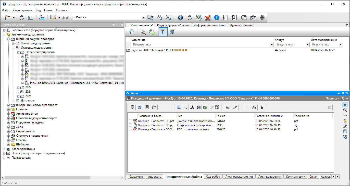 В результате выполнения команды Задача на подпись автоматически закрывается. Объект (документ) переходит в следующий статус - Подписан/Зарегистрировано (в зависимости от заданных параметров для регистрации). Автор объекта (документа) информируется системой о подписании. На карточке Свойств объекта (документа) заполняется поле Дата (дата и время подписи).