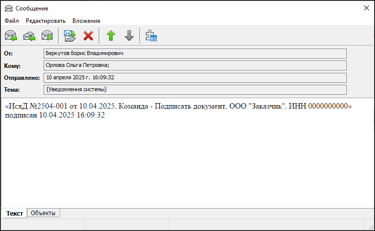 В результате выполнения команды Задача на подпись автоматически закрывается. Объект (документ) переходит в статус - Зарегистрировано (в примере регистрационный номер получен до подписания). Автор объекта (документа) информируется системой о подписании. На карточке Свойств объекта (документа) заполняется поле Дата (дата и время подписи).