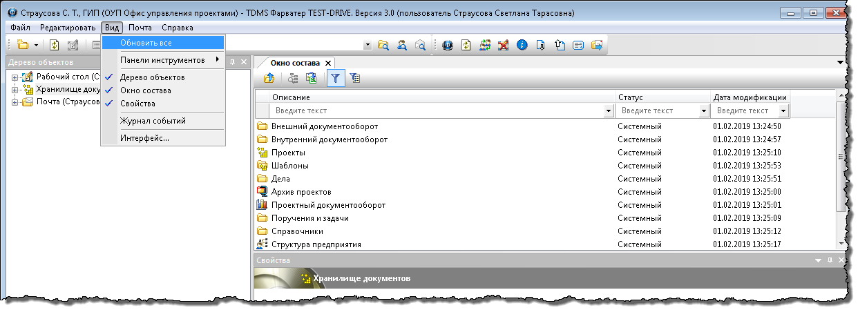 Но возможны случаи, когда пользователь, войдя в систему, длительное время не совершает каких-либо действий. Это приводит к тому, что отображаемая ему информация в окне Дерево объектов устаревает и перед началом работы ее необходимо обновить.