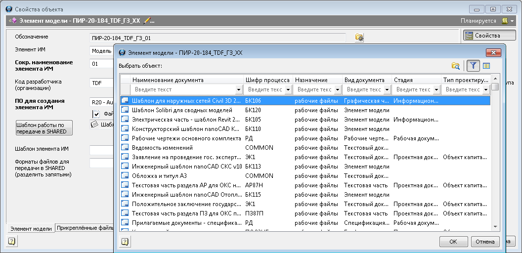 ![]() 3.6 Нажать кнопку Шаблон работы по передаче в SHARED. В открывшемся окне Выберите шаблон работ - выбрать требуемый шаблон и закрыть окно кнопкой ОК.