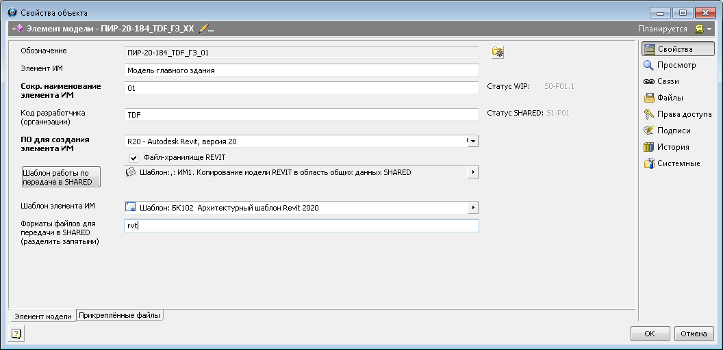 ![]() 3.8 Ввести вручную данные в поле Форматы файлов для передачи в SHARED. Файлы указанных форматов будут автоматически прикреплены к Элементу модели после его передачи в область SHARED.