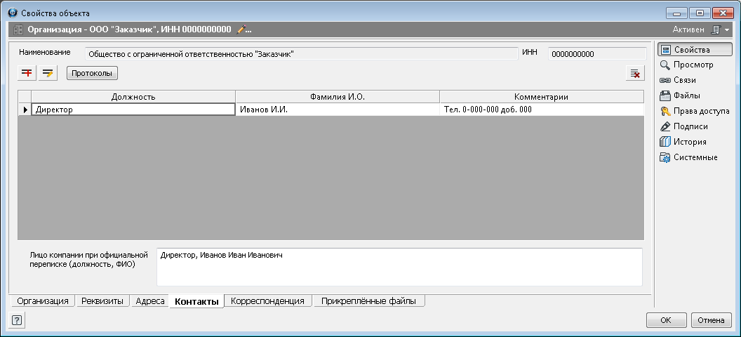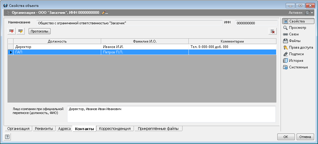 ![]() Лицо компании при официальной переписке (должность, ФИО) - поле, отображающее должность, фамилию и инициалы контактного лица, на имя которого должна адресоваться переписка с данным предприятием. Сведения заносятся вручную и имеют справочный характер. Какая-либо связь этого поля с таблицей на вкладке отсутствует.