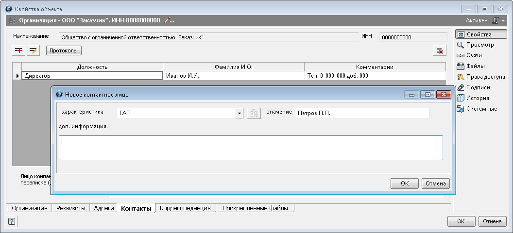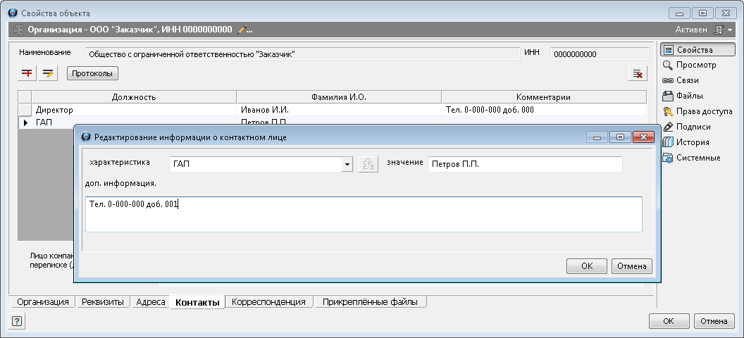 ·В поля открывшегося диалогового окна Редактирование информации о контактном лице ввести требуемые изменения и закрыть окно кнопкой ОК;