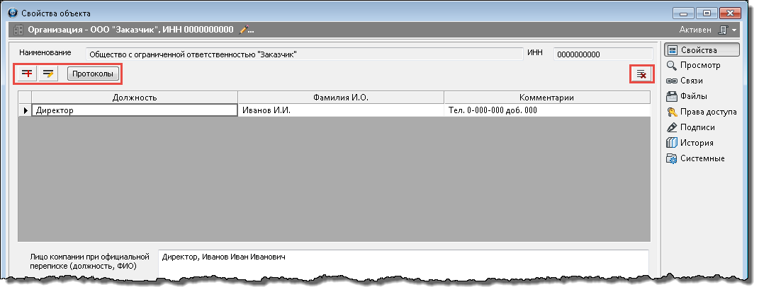 ·Данные в поле Лицо компании при официальной переписке (Должность, ФИО) редактируются как обычный текст. Для этого необходимо переместить курсор в поле и ввести требуемые изменения.