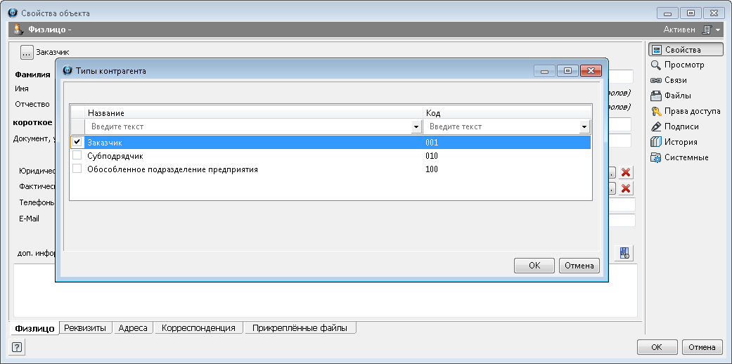 ·В открывшемся окне Типы контрагента отметить флагом требуемый и закрыть окно кнопкой ОК. Допускается задавать одному контрагенту несколько типов;