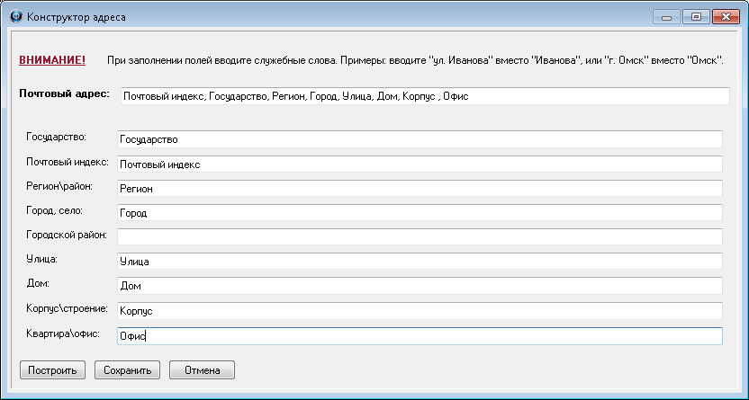 ![]() ·В поля открывшегося окна Конструктор адреса ввести требуемые данные. После ввода данных нажать кнопку Построить для заполнения поля Почтовый адрес и закрыть окно кнопкой Сохранить;