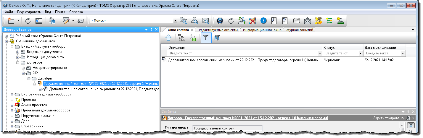 6. Закрыть окно создания допсоглашения кнопкой ОК в правом нижнем углу. Допсоглашение будет сохранено в структуре договора, для которого оно создавалось.
