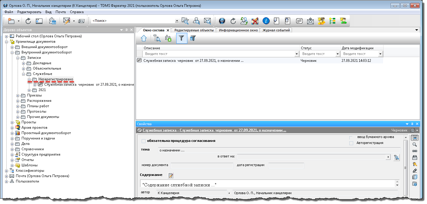 7.2 Окно закроется. Записка будет сохранен в папке Незарегистрировано подраздела, соответствующего типу этой записки (в данном примере - в подразделе Служебные).