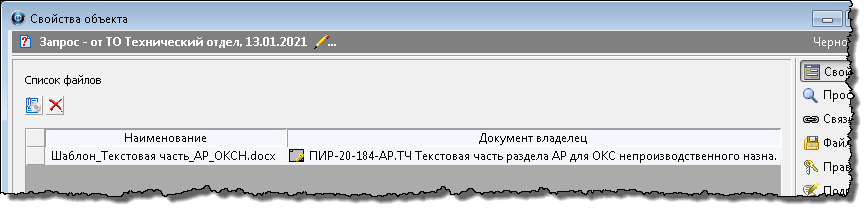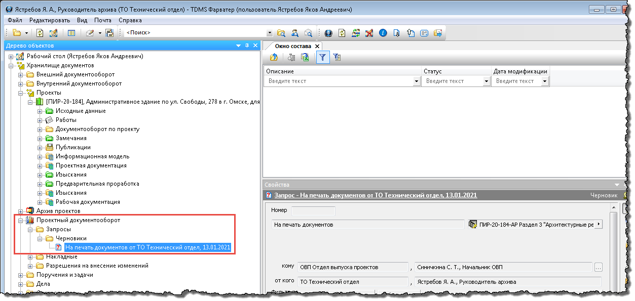 5. Созданный запрос будет размещен в папке Черновики раздела Запросы (Хранилище документов/Проектный документооборот/Запросы).