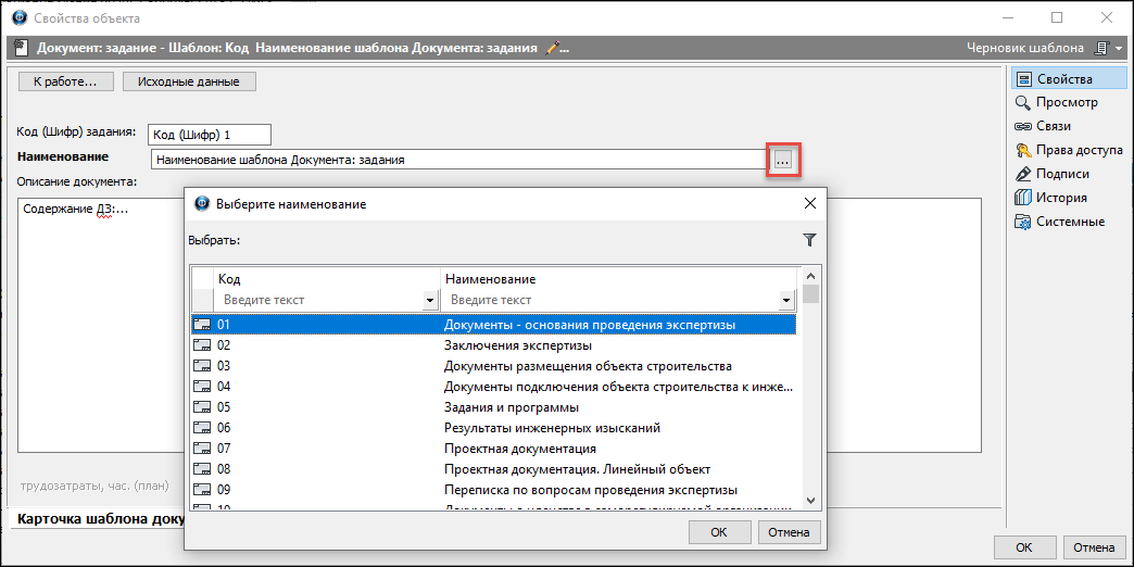 Отредактировать (если требуется) данные в поле Код (Шифр) задания для данного шаблона документа;